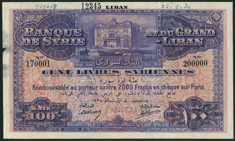 Banque de Syrie et du Grand Liban, specimen 100 livres, 1 January 1935, serial number 170001-200000, purple and multicoloured, LIBAN in text top centre, bank building top centre, value at centre and at each corner, signatures of Berard and Laferriere, reverse purple-brown, orange and green, town and mountains, value at lower centre left and right