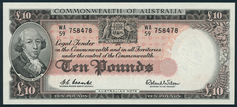 Commonwealth of Australia, £10, ND (1960-1965), serial number WA/59 758478, black and pink, Governor Philip at left, arms top centre, Coombs Wilson signatures, reverse red, maiden (Science) at right