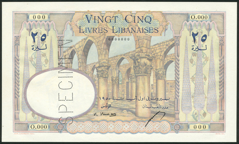 Banque de Syrie et du Liban, specimen 25 livres, 1950, zero serial numbers, pale blue and multicoloured, ruins at centre, Berard and Laferriere signatures , reverse lilac and multicoloured, lion´s mask and border of flowers