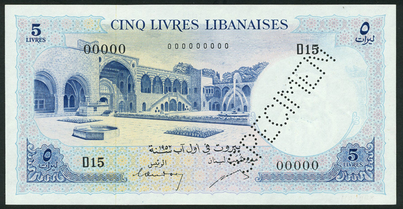 Banque de Syrie et du Liban, specimen 5 livres, 1952, serial number D15 00000, dark blue on multicolour underprint, palace courtyard at centre left, reverse snowy mountains with trees