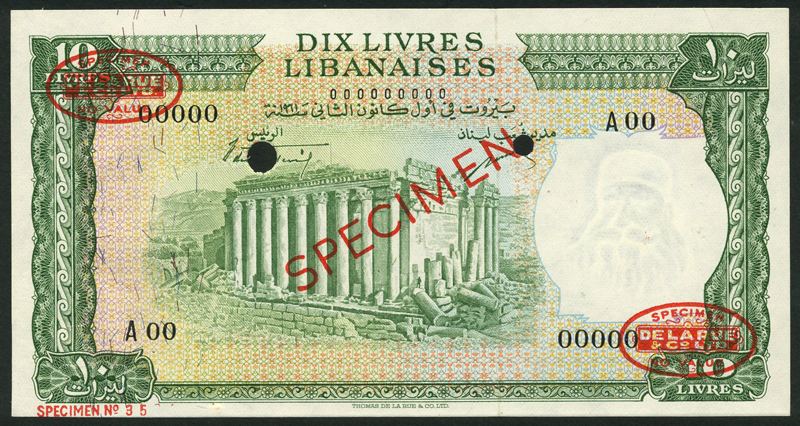 Banque de Syrie et du Liban, specimen 10 livres, 1961, black zero serial numbers, green on multicolour underprint, Temple of Bacchus at centre, value at each corner, reverse green, shoreline and city