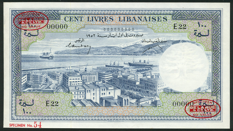 Banque de Syrie et du Liban, specimen 1 livre, 1957, brown, 5 livres, 1955, blue, 10 livres, 1952, green, 25 livres, 1952, blue, 50 livres, 1952, purple-brown and 100 livres, 1952,