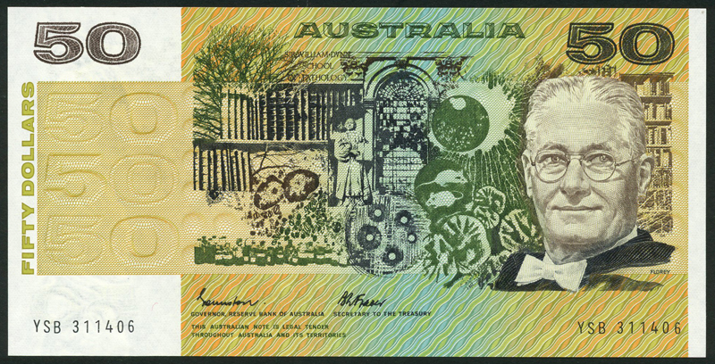 Commonwealth of Australia, $50 (3), ND (1985), serial numbers YSB 311406/407/408, green and multicoloured, Lord Florey at right, Johnston and Fraser signatures