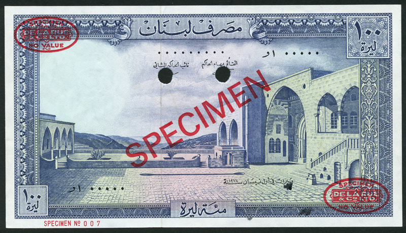 Banque du Liban, specimen 100 livres (3), 1974, 1977, 1978, blue and multicolour, the courtyard at the palace at Beit-ed-Din