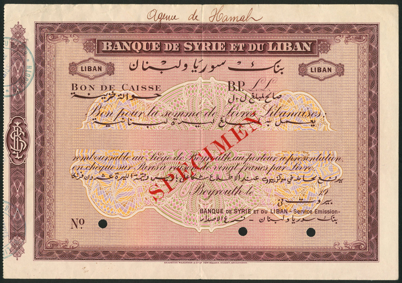 Banque de Syrie et du Liban, specimen treasury bill, Liban, ND (c.1930´s-40´s), uniface, dark red on multicolour underprint, bank title at top centre, space in underprint for handwritten value at centre