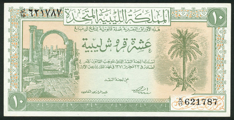 United Kingdom of Libya, 5 piastres, red, also 10 piastres, green, both 1951, ruins at left, arms at right