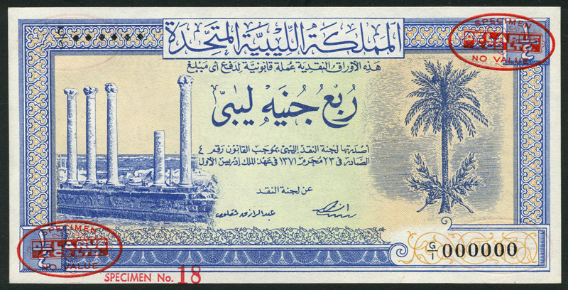 United Kingdom of Libya, specimen 5 piastres, law of 1951, prefix L/2, red and pale green, ruins, specimen 10 piastres, law of 1951, prefix K./2, green and pale pink, ruins and a specimen 1/4 pound, law of 1951, prefix G/1, blue, plale green and pale orange, ruins, all arms at right