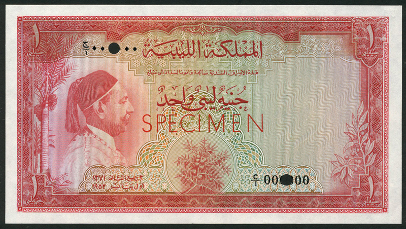 Kingdom of Libya, colour trial 1 Libyan pound, 1 January 1952, serial number C/1 000000, red and multicoloured, King Idris at left, reverse red, value and bank title