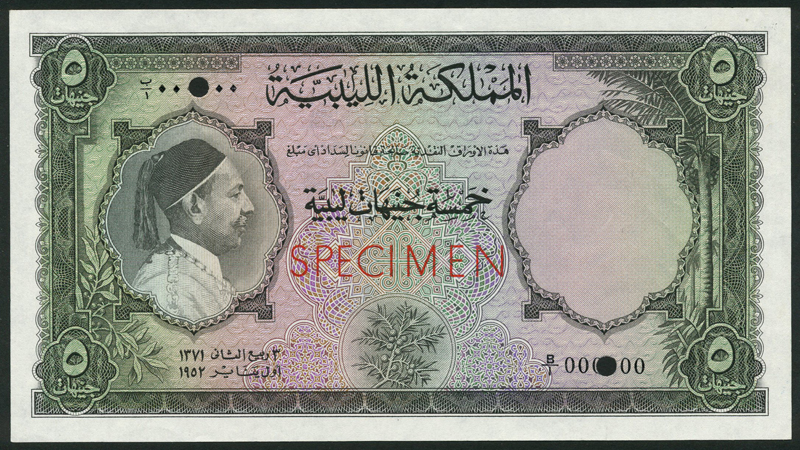 Kingdom of Libya, colour trial 5 pounds, 1 January 1952, serial number B/1 000000, dark grey-green and multicoloured, King Idris at left, bush low centre, palm tree at right, value and at each corner, reverse dark grey and multicoloured, value at centre and at each corner