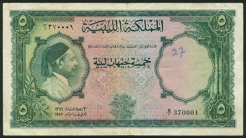 Kingdom of Libya, £5, 1 January 1952, serial number B/1 370001, green on multicolour underprint, King Idris at left, value at each corner