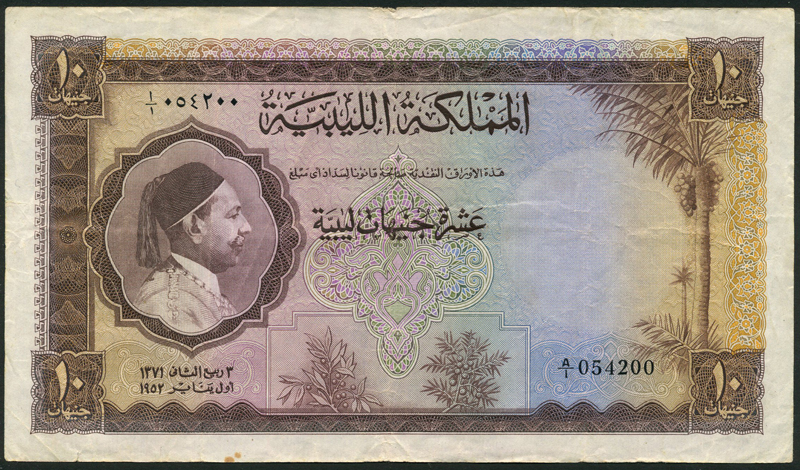 Kingdom of Libya, £10, 1 January 1952, serial number A/1 054200, brown on multicolour underprint, King Idris at left, value at each corner