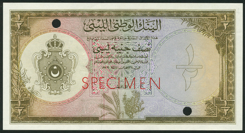 National Bank of Libya, colour trial 1/2 Libyan pound, 26 April 1955, serial number D/1 000000, olive and multicoloured, arms at left, reverse olive, value and bank title, also colour trial 1 pound, serial number C/10 000000, brown and multicoloured, arms at left