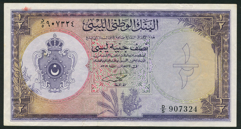National Bank of Libya, £½, L.1955 (1959), black serial number, purple on multicolour underprint, arms at left, value at right and each corner