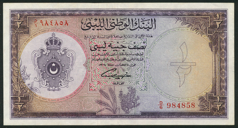 National Bank of Libya, £½, L.1955 (1959), red serial number, purple on multicolour underprint, arms at left, value at right and each corner