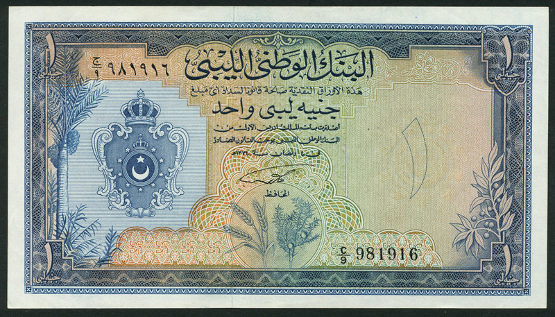 National Bank of Libya, £1, L.1955 (1959), black serial number, dark blue on multicolour underprint, arms at left, value at right and each corner