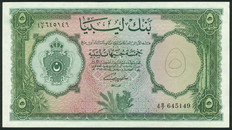 Bank of Libya, £5, L.1963, first issue, green on multicolour underprint, arms at left, value at right and each corner