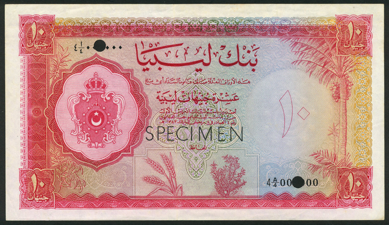 Bank of Libya, colour trial 10 pounds, ND (1963), serial number 4 A/4 000000, red on multicolour underprint, arms at left, value at right and each corner, trees and plants at low centre, left and right