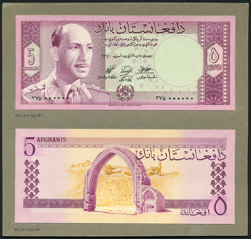 Bank of Afghanistan, an obverse and reverse composite essay on board for a 2 afghanis, SH1340 (1962), zero serial numbers, green and pale pink, King Muhammad Zahir at left, arms low centre, reverse green and pale blue, tree at centre, reverse obverse and reverse 5 afghanis on board, SH1340 (1962), lilac and pale green, King Muhammad Zahir at left, reverse lilac, ancient archway