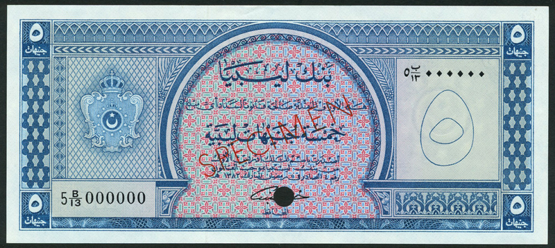 Bank of Libya, colour trial 1/4 pound, blue-gray, colour trial 1/2 pound, red, colour trial 1 pound, green, colour trial 5 pounds, blue, all law of 1963 (second issue), all zero serial numbers, arms at left, value at right