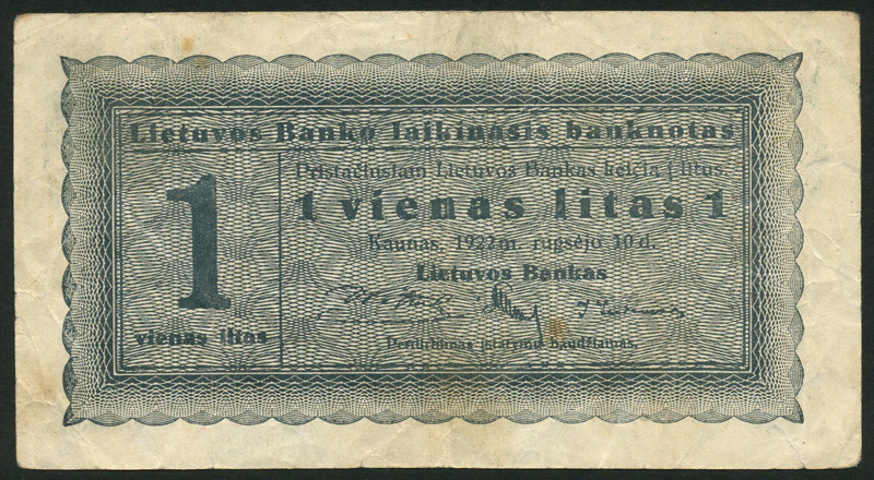 Bank of Lithuania, 1 centas, 5 centu and 1 litas, 10 September 1922, dark blue, green and grey respectively, value at left and right