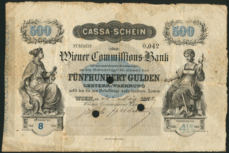 Wiener Commissions-Bank, Cassen-Schein, 500 gulden, Wien, 30 May 1872, serial number 0042, black, grey and white, pale blue central guilloche, value in blue top left and right, 4 1/2 percent in blue low right, allegorical maiden at left and right, manuscript signatures below, reverse ´ZINSEN-TABELLE´