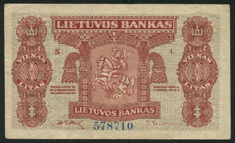 Bank of Lithuania, 1, 10 and 50 centu, and 1 lias, 1922, (Pick 7, 10, 12, 13), first two extremely fine, others very fine, scarce (4)