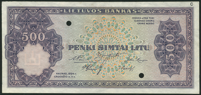 Bank of Lithuania, colour trial 500 litu, Kaunas, 1924, violet and multicoloured, value at left and right, reverse brown and yellow and green, arms top centre, value at left and right