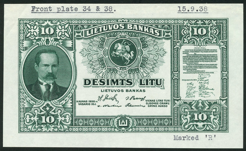 Bank of Lithuania, an obverse and reverse uniface die proof for a 10 litu, Kaunas, 1938, green and white, President Smetona at left, arms top centre, reverse green and white, the Council of Lithuania at centre, value at each corner