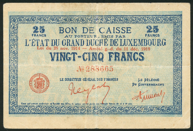 L´Etat du Grand-Duche de Luxembourg, 25 francs, L.1914-1918 (1919), serial number 288665, blue on blue-green underprint, ornate border, value at top left and right