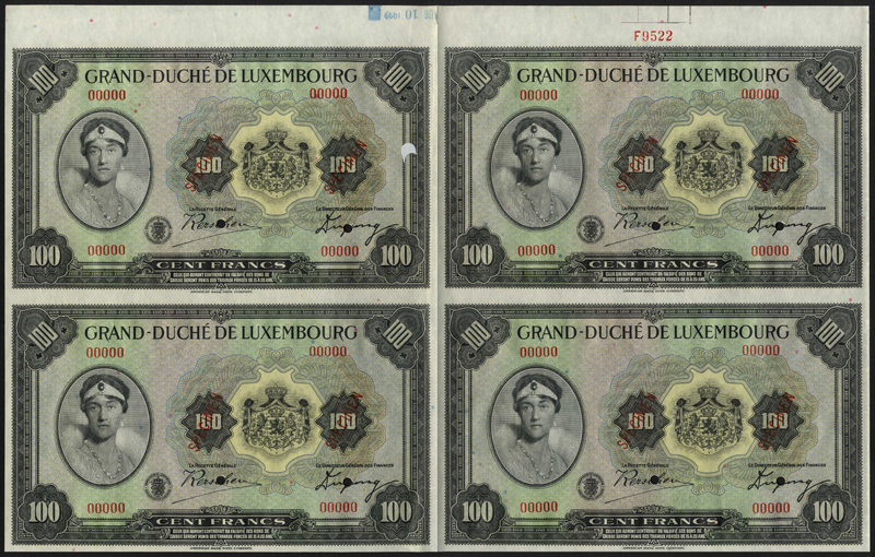 Grand-Duche de Luxembourg, sheet of four colour trial 100 francs, ND (1944), all with red zero serial numbers, dark green, Grand Duchess Charlotte at left, arms at right, flanked by values, values also at each corner, reverse green, seated woman with globe and anvil