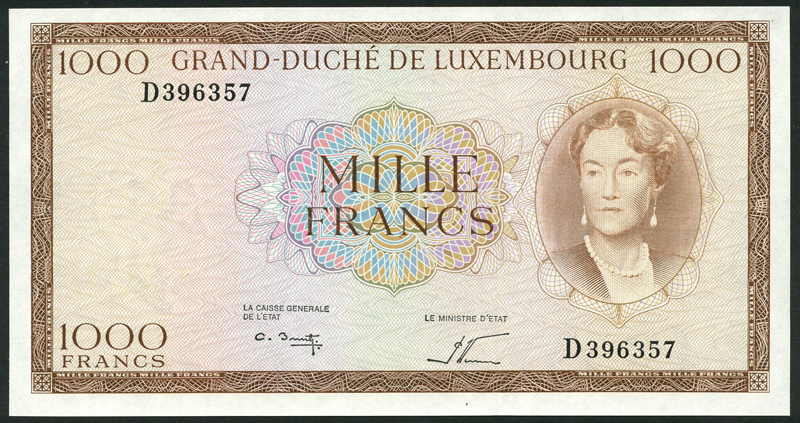 Grand-Duche de Luxembourg, 1000 francs, ND (c1961-63), serial number D396357, brown on multicolour underprint, Grande Duchess Charlotte at right, reverse arms at centre