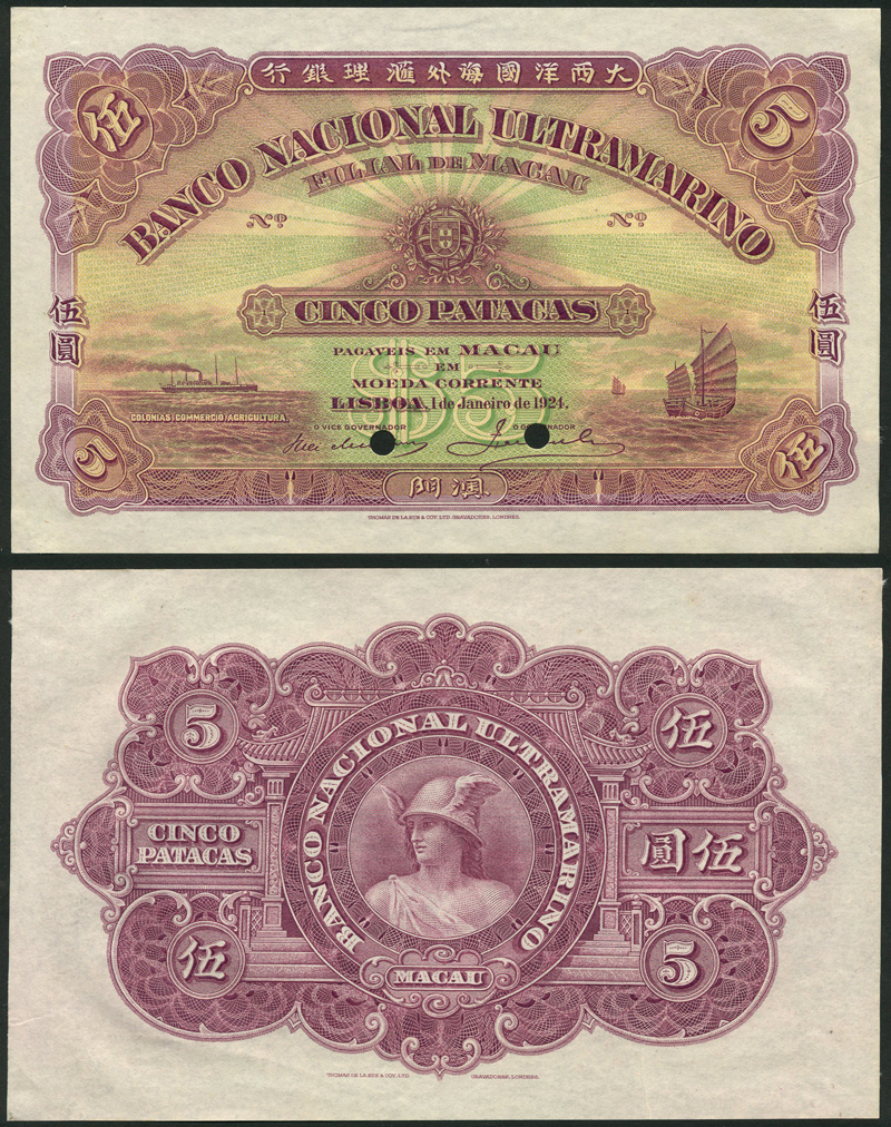 Banco Nacional Ultramarino, Macao, uniface obverse and reverse colour trial 5 patacas, 1 January 1924, purple and pale yellow and pink, arms at centre, steamship at left, junk at right, value in pale green low centre, reverse purple, head of Mercury at centre