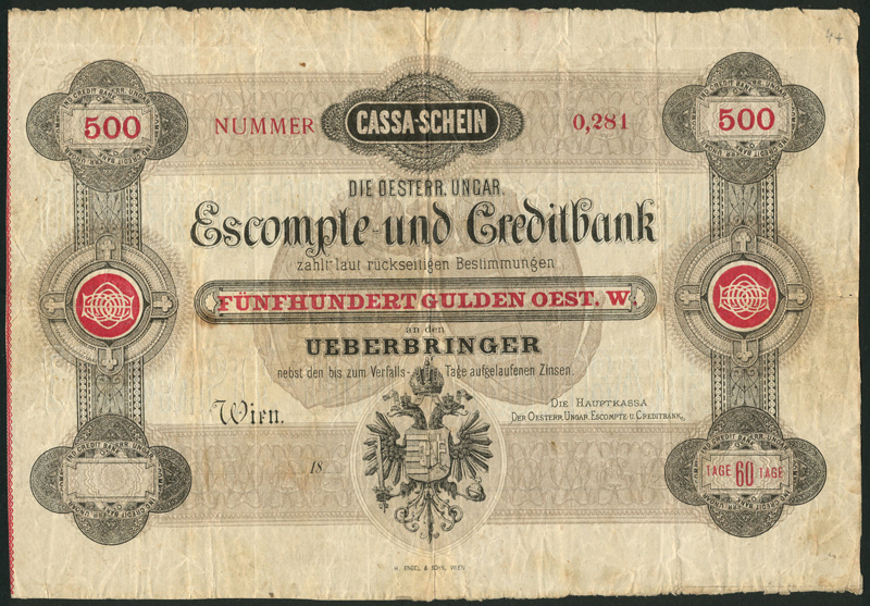 Die Oesterr. Ungar Escompte-und Creditbank, 500 gulden, 18-, red serial number 0281, value in red at centre and top left and right, Imperial arms low centre, arms in mauve-brown central motif, reverse ´ZINSEN-TABELLE´