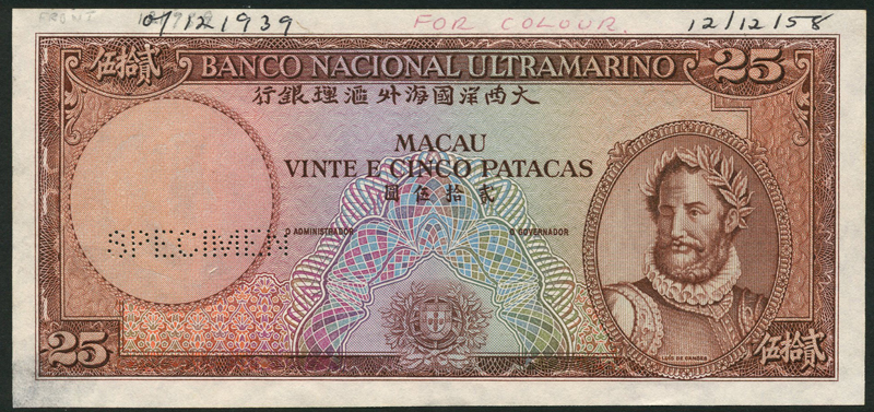 Banco Nacional Ultramarino, Macao, 25 patacas (2), 20 November 1958, serial number B000001-B050000, brown and multicoloured, Luis De Camoes at right, arms at low centre, reverse brown and lilac, maiden and ships together with another undated and unnumbered example