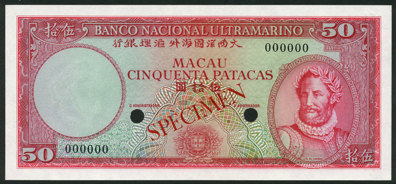 Banco Nacional Ultramarino, Macao, colour trial 50 patacas, ND (type of 1958), zero serial numbers, red and pale green, Luis de Camoes at right, arms low centre, reverse red and pale blue, youth and ships at centre, ship seal at left