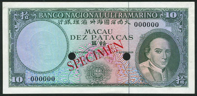 Banco Nacional Ultramarino, Macao, colour trial 10 patacas, ND (1963), zero serial numbers, green and multicoloured, Carneiro at right, arms low centre, also a specimen 10 patacas of the same date in blue