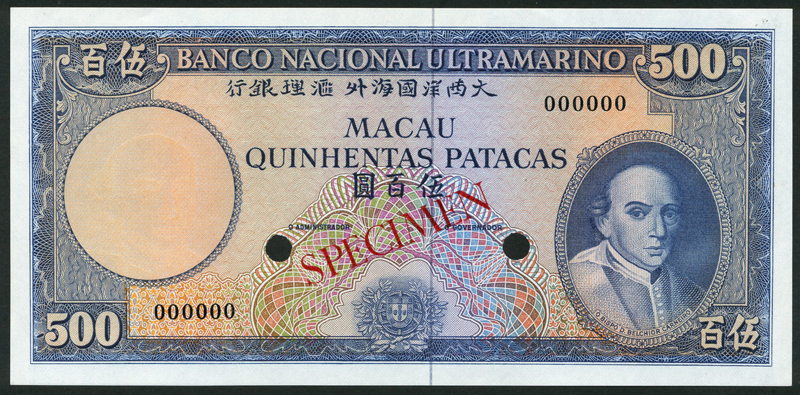 Banco Nacional Ultramarino, Macao, specimen 500 patacas, 24 April 1979, serial number 000000, green and multicolour, Carneiro at right, arms at low centre, reverse green and lilac, maiden and ships, ship seal at left , also a colour trial 500 patacas, ND (1963), serial number 000000, blue and multicoloured, Carneiro at right