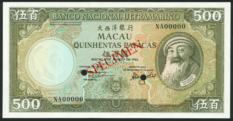 Banco Nacional Ultramarino, Macao, specimen 500 patacas , 8 August 1981, serial number NA 00000, green and multicoloured, De Morais at right, arms low centre