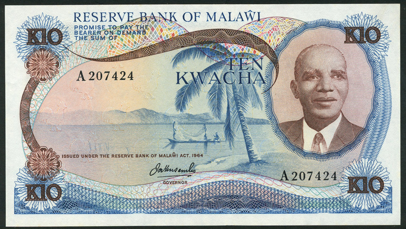 Reserve Bank of Malawi, 10 kwacha, ND (1973), serial number A207424, blue and brown on multicolour underprint, Dr Hastings Banda at right, fisherman and palm at centre, value at each corner
