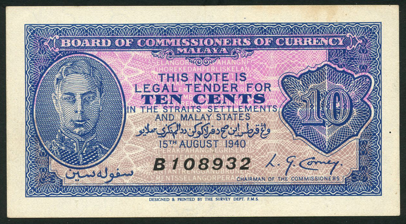 Board of Commissioners of Currency, Malaya, 10 cents, 15 August 1940, serial number B108932, blue on pink and tan underprint, also 1 cent, 5, 10, 20 (2) and 50 cents, all 1 July 1941, all with George VI at left