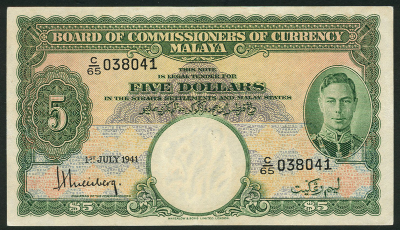 Board of Commissioners of Currency, Malaya, $1, 1 July 1941, prefix M/91, blue and multicoloured, George VI at right, value at left, reverse blue, arms , also $5, 1 July 1941, green and mauve and pale yellow, George VI at right, value at left