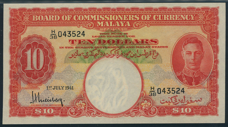 Board of Commissioners of Currency, Malaya, $10, 1 July 1941, serial number H/38 043524, red and multicoloured, George VI at right, value at left, reverse red and white, arms