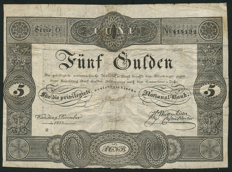 Privilegirte Oesterreichische National-Bank, 5 gulden, 9 December 1833, serial number O 415192, dark grey and white, value at left and right and top centre, printed signatures low right
