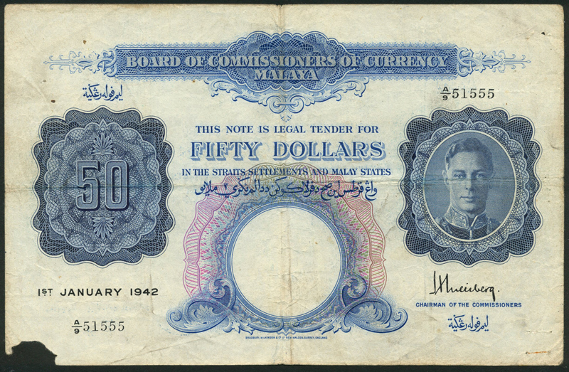Board of Commissioners of Currency, Malaya, $50, 1 January 1942, serial number A/9 51555, blue, purple and multicolour, George VI at right, value at centre and laft, reverse arms and values
