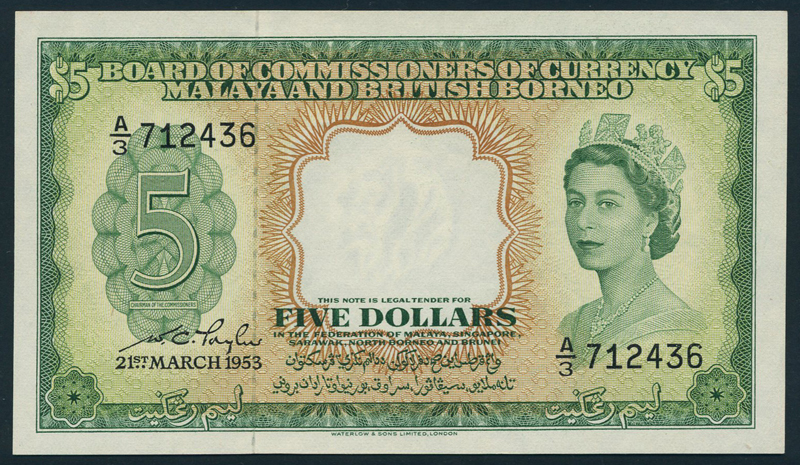 Board of Commissioners of Currency, Malaya and British Borneo, $5, 21 March 1953, serial number A/3 712436, green and multicoloured, Elizabeth II at right, value at left, reverse green and white, arms