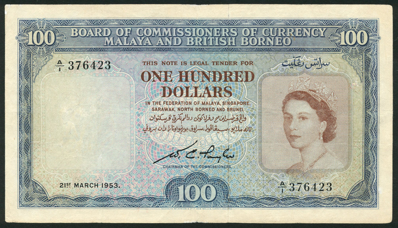 Board of Commissioners of Currency, Malaya and British Borneo, $100, 21 March 1953, serial number A/1 376423, blue and brown on multicolour underprint, Elizabeth II at right, value at low centre and top corners, reverse purple, arms and value