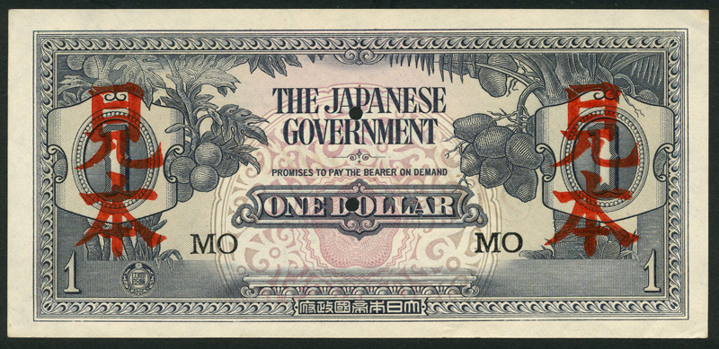Malaya Japanese Occupation, The Japanese Government, specimen $1, ND (1942), block MO, dark blue on pink underprint, value at centre and left and right, breadfruit and coconut trees