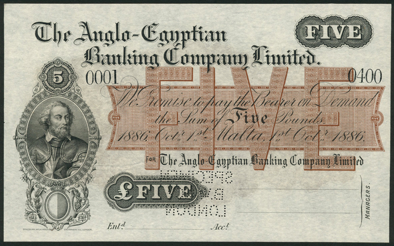 The Anglo-Egyptian Banking Company, specimen £5, Malta, 1 October 1886, serial number 0001-4000, black and white, value in brown panel at centre, Grand Master La Valette at left