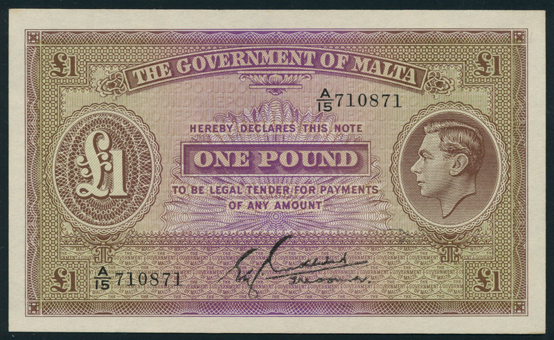 Government of Malta, £1 (2), ND (1940), prefixes A/15 and A/18, brown-green and lilac, George VI at right, value at left, Cuschieri signature low right