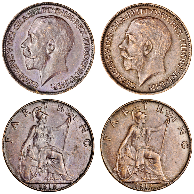 George V, Farthings (2), 1915 (2) obverse 1 + reverse 2 (Freeman 593A; S.4059 var.), one almost uncirculated, the other, nearly extremely fine, a very rare variety (2)